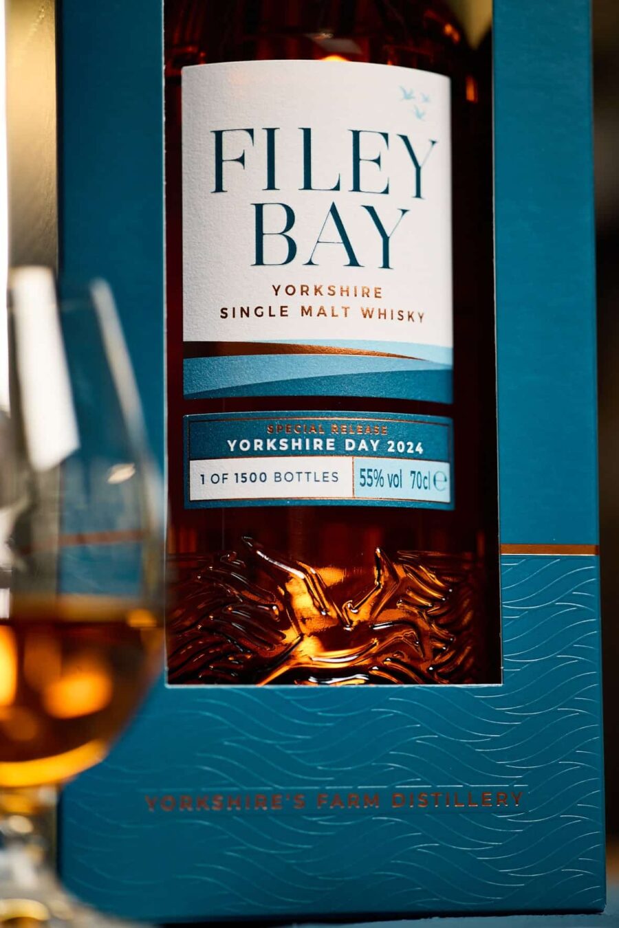 A bottle of Filey bay Yorkshire Day 2024, with a glass next to it, sits on a cask with the Spirit ssafe behind in the beautiful new blue and copper Special Release carton